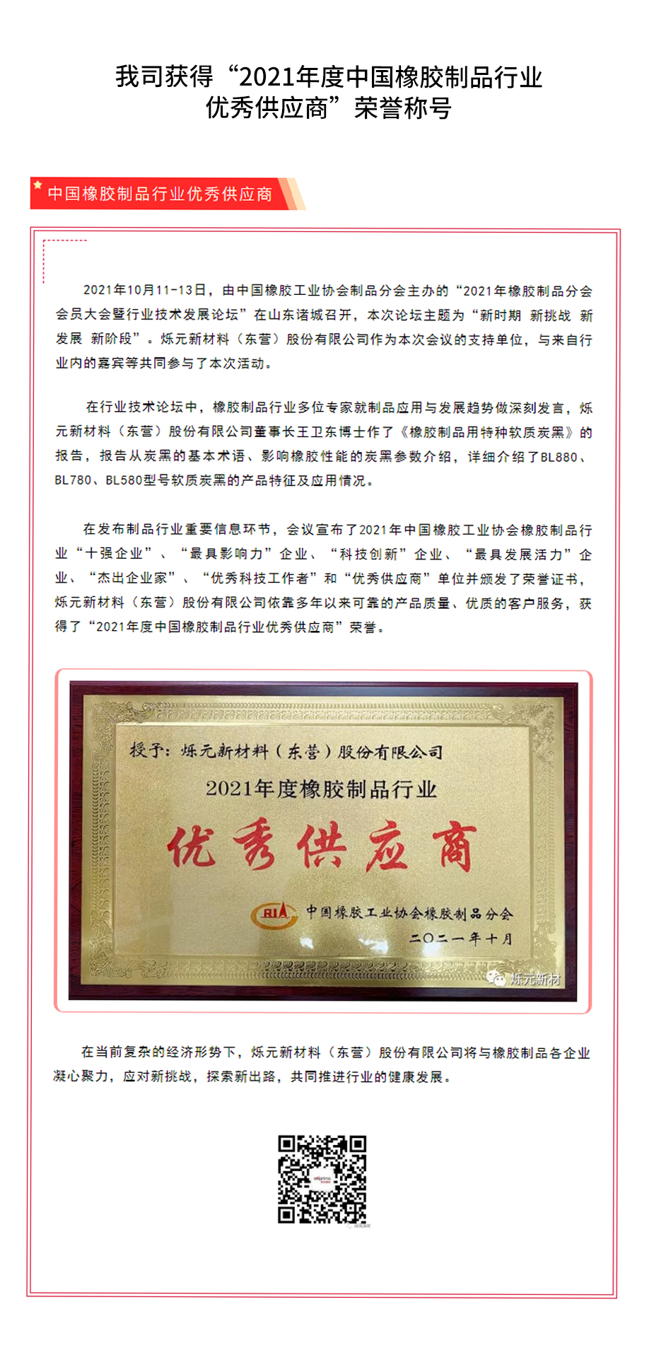 我司(si)獲得“2021年(nián)度中國(guo)橡膠制(zhì)品行業(ye) 優秀供(gong)應商”榮(róng)譽🛀🏻稱号(hào)