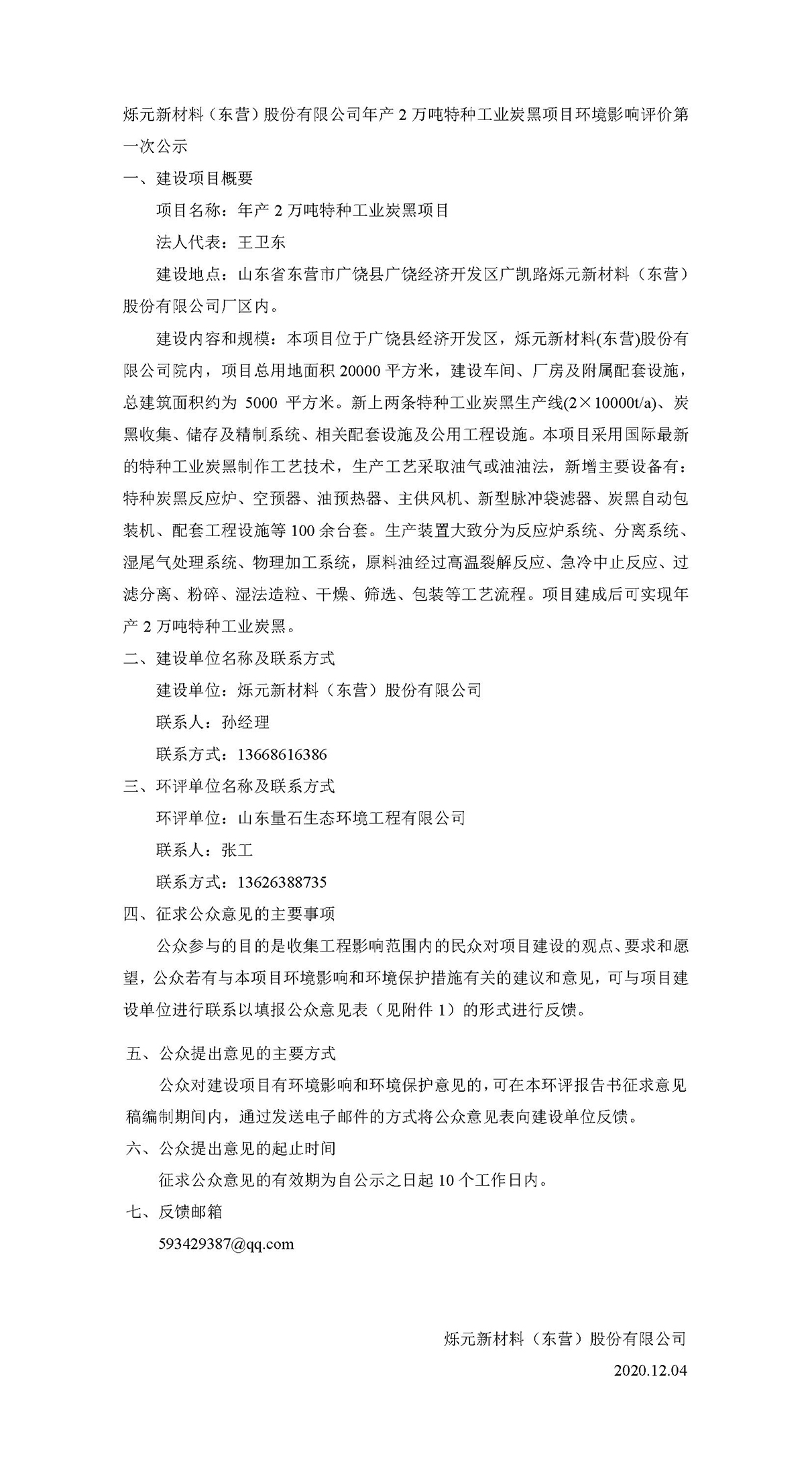 公司(sī)年産2萬(wàn)噸特種(zhǒng)工業炭(tan)黑項目(mù)環境影(ying)響評價(jià)第一次(ci)公示